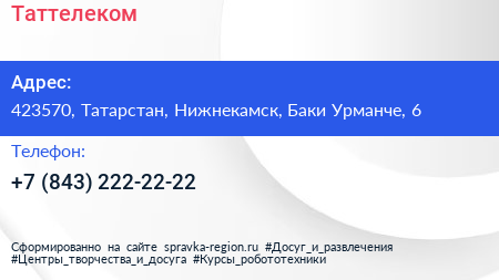 Таттелеком по адресу 423570, Татарстан, Нижнекамск, Баки Урманче, 6 в дальнейшем Организация, размещена в следующих категориях: