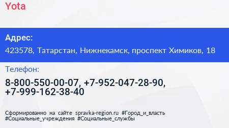 Yota по адресу 423578, Татарстан, Нижнекамск, проспект Химиков, 18 в дальнейшем Организация, размещена в следующих категориях: