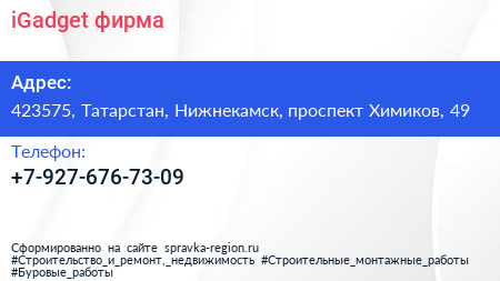 iGadget, фирма по адресу 423575, Татарстан, Нижнекамск, проспект Химиков, 49 в дальнейшем Организация, размещена в следующих категориях: