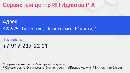 Сервисный центр, ИП Идиятов Р.А. по адресу 423575, Татарстан, Нижнекамск, Юности, 1 в дальнейшем Организация, размещена в следующих категориях: