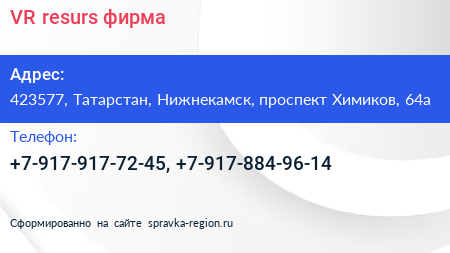 VR-resurs, фирма по адресу 423577, Татарстан, Нижнекамск, проспект Химиков, 64а в дальнейшем Организация, размещена в следующих категориях: