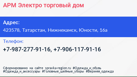 АРМ-Электро, торговый дом по адресу 423578, Татарстан, Нижнекамск, Юности, 16а в дальнейшем Организация, размещена в следующих категориях: