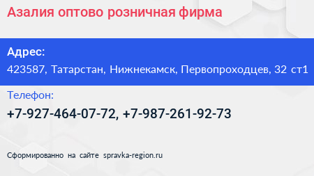 Азалия, оптово-розничная фирма по адресу 423587, Татарстан, Нижнекамск, Первопроходцев, 32 ст1 в дальнейшем Организация, размещена в следующих категориях: