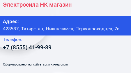 Электросила-НК, магазин по адресу 423587, Татарстан, Нижнекамск, Первопроходцев, 7в в дальнейшем Организация, размещена в следующих категориях: