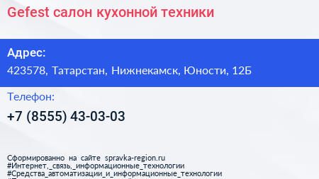 Gefest, салон кухонной техники по адресу 423578, Татарстан, Нижнекамск, Юности, 12Б в дальнейшем Организация, размещена в следующих категориях: