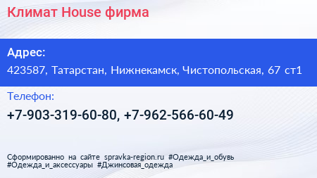 Климат House, фирма по адресу 423587, Татарстан, Нижнекамск, Чистопольская, 67 ст1 в дальнейшем Организация, размещена в следующих категориях:
