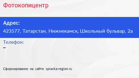 Фотокопицентр по адресу 423577, Татарстан, Нижнекамск, Школьный бульвар, 2а в дальнейшем Организация, размещена в следующих категориях: