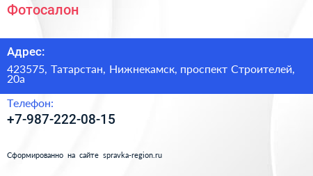 Фотосалон по адресу 423575, Татарстан, Нижнекамск, проспект Строителей, 20а в дальнейшем Организация, размещена в следующих категориях: