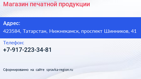 Магазин печатной продукции по адресу 423584, Татарстан, Нижнекамск, проспект Шинников, 41 в дальнейшем Организация, размещена в следующих категориях: