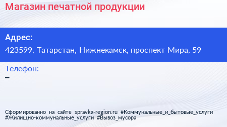 Магазин печатной продукции по адресу 423599, Татарстан, Нижнекамск, проспект Мира, 59 в дальнейшем Организация, размещена в следующих категориях: