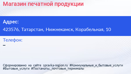 Магазин печатной продукции по адресу 423576, Татарстан, Нижнекамск, Корабельная, 10 в дальнейшем Организация, размещена в следующих категориях: