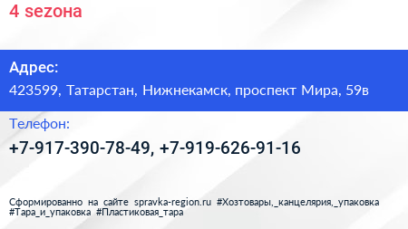 4 sezoнa по адресу 423599, Татарстан, Нижнекамск, проспект Мира, 59в в дальнейшем Организация, размещена в следующих категориях:
