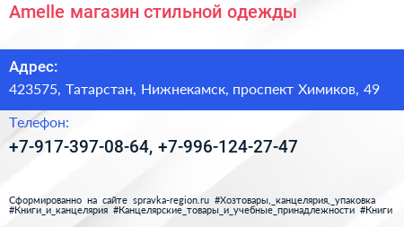 Amelle, магазин стильной одежды по адресу 423575, Татарстан, Нижнекамск, проспект Химиков, 49 в дальнейшем Организация, размещена в следующих категориях: