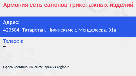 Армония, сеть салонов трикотажных изделий по адресу 423584, Татарстан, Нижнекамск, Менделеева, 31а в дальнейшем Организация, размещена в следующих категориях: