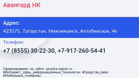 Авангард-НК по адресу 423575, Татарстан, Нижнекамск, Ахтубинская, 4е в дальнейшем Организация, размещена в следующих категориях: