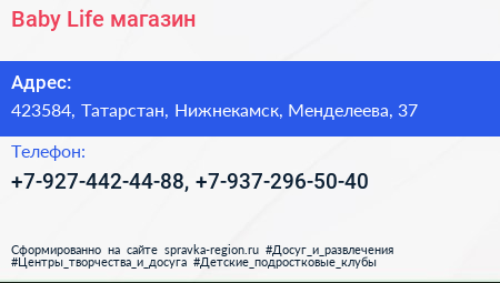 Baby Life, магазин по адресу 423584, Татарстан, Нижнекамск, Менделеева, 37 в дальнейшем Организация, размещена в следующих категориях: