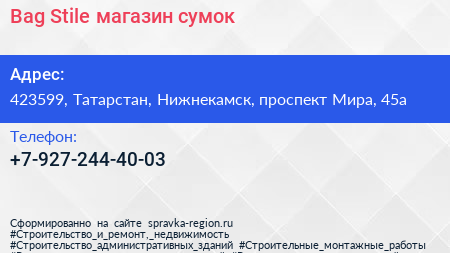 Bag Stile, магазин сумок по адресу 423599, Татарстан, Нижнекамск, проспект Мира, 45а в дальнейшем Организация, размещена в следующих категориях: