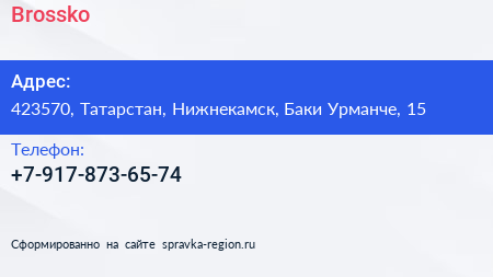 Brossko по адресу 423570, Татарстан, Нижнекамск, Баки Урманче, 15 в дальнейшем Организация, размещена в следующих категориях: