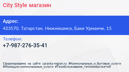 City-Style, магазин по адресу 423570, Татарстан, Нижнекамск, Баки Урманче, 15 в дальнейшем Организация, размещена в следующих категориях: