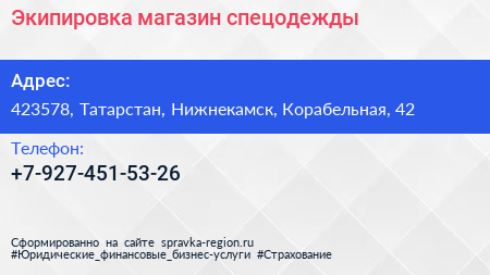 Экипировка, магазин спецодежды по адресу 423578, Татарстан, Нижнекамск, Корабельная, 42 в дальнейшем Организация, размещена в следующих категориях: