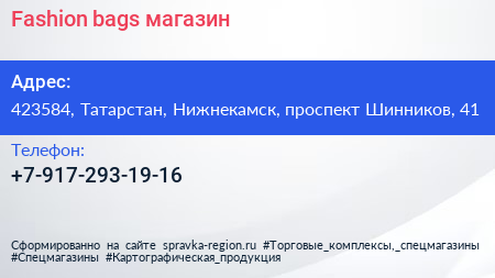Fashion bags, магазин по адресу 423584, Татарстан, Нижнекамск, проспект Шинников, 41 в дальнейшем Организация, размещена в следующих категориях: