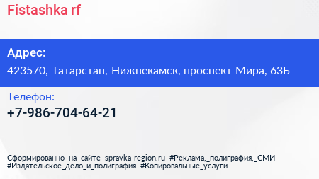 Fistashka.rf по адресу 423570, Татарстан, Нижнекамск, проспект Мира, 63Б в дальнейшем Организация, размещена в следующих категориях: