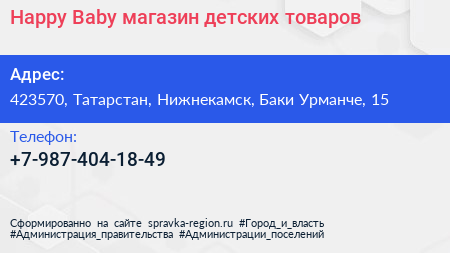 Happy Baby, магазин детских товаров по адресу 423570, Татарстан, Нижнекамск, Баки Урманче, 15 в дальнейшем Организация, размещена в следующих категориях: