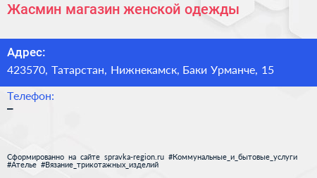 Жасмин, магазин женской одежды по адресу 423570, Татарстан, Нижнекамск, Баки Урманче, 15 в дальнейшем Организация, размещена в следующих категориях: