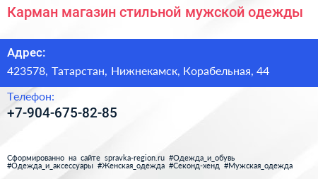 Карман, магазин стильной мужской одежды по адресу 423578, Татарстан, Нижнекамск, Корабельная, 44 в дальнейшем Организация, размещена в следующих категориях: