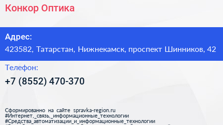 Конкор-Оптика по адресу 423582, Татарстан, Нижнекамск, проспект Шинников, 42 в дальнейшем Организация, размещена в следующих категориях: