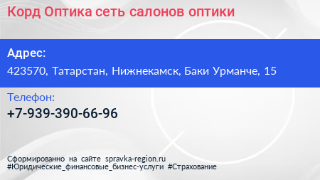 Корд Оптика, сеть салонов оптики по адресу 423570, Татарстан, Нижнекамск, Баки Урманче, 15 в дальнейшем Организация, размещена в следующих категориях: