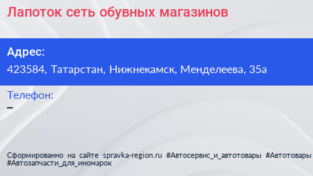 Лапоток, сеть обувных магазинов по адресу 423584, Татарстан, Нижнекамск, Менделеева, 35а в дальнейшем Организация, размещена в следующих категориях: