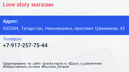 Love story, магазин по адресу 423584, Татарстан, Нижнекамск, проспект Шинников, 41 в дальнейшем Организация, размещена в следующих категориях:
