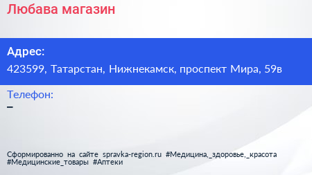 Любава, магазин по адресу 423599, Татарстан, Нижнекамск, проспект Мира, 59в в дальнейшем Организация, размещена в следующих категориях: