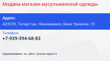 Мадина, магазин мусульманской одежды по адресу 423570, Татарстан, Нижнекамск, Баки Урманче, 15 в дальнейшем Организация, размещена в следующих категориях: