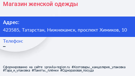 Магазин женской одежды по адресу 423585, Татарстан, Нижнекамск, проспект Химиков, 10 в дальнейшем Организация, размещена в следующих категориях: