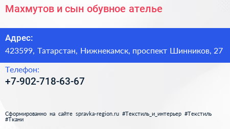 Махмутов и сын, обувное ателье по адресу 423599, Татарстан, Нижнекамск, проспект Шинников, 27 в дальнейшем Организация, размещена в следующих категориях:
