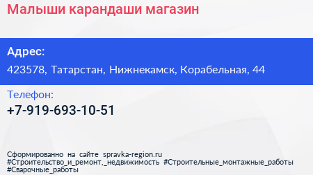 Малыши-карандаши, магазин по адресу 423578, Татарстан, Нижнекамск, Корабельная, 44 в дальнейшем Организация, размещена в следующих категориях: