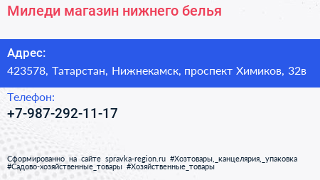 Миледи, магазин нижнего белья по адресу 423578, Татарстан, Нижнекамск, проспект Химиков, 32в в дальнейшем Организация, размещена в следующих категориях: