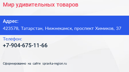 Мир удивительных товаров по адресу 423578, Татарстан, Нижнекамск, проспект Химиков, 37 в дальнейшем Организация, размещена в следующих категориях: