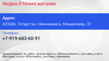 Модна`Я Мама, магазин по адресу 423584, Татарстан, Нижнекамск, Менделеева, 37 в дальнейшем Организация, размещена в следующих категориях: