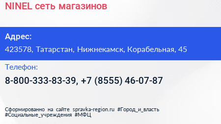 NINEL, сеть магазинов по адресу 423578, Татарстан, Нижнекамск, Корабельная, 45 в дальнейшем Организация, размещена в следующих категориях: