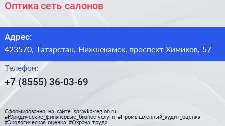 Оптика, сеть салонов по адресу 423570, Татарстан, Нижнекамск, проспект Химиков, 57 в дальнейшем Организация, размещена в следующих категориях: