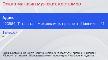 Оскар, магазин мужских костюмов по адресу 423584, Татарстан, Нижнекамск, проспект Шинников, 41 в дальнейшем Организация, размещена в следующих категориях:
