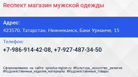 Rеспект, магазин мужской одежды по адресу 423570, Татарстан, Нижнекамск, Баки Урманче, 15 в дальнейшем Организация, размещена в следующих категориях: