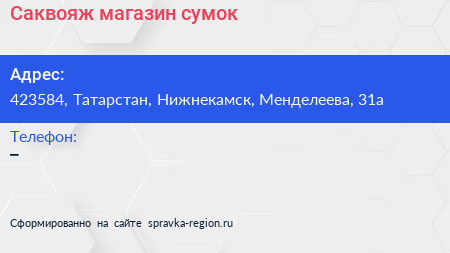 Саквояж, магазин сумок по адресу 423584, Татарстан, Нижнекамск, Менделеева, 31а в дальнейшем Организация, размещена в следующих категориях: