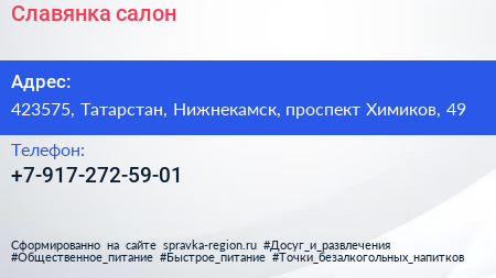 Славянка, салон по адресу 423575, Татарстан, Нижнекамск, проспект Химиков, 49 в дальнейшем Организация, размещена в следующих категориях: