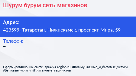 Шурум бурум, сеть магазинов по адресу 423599, Татарстан, Нижнекамск, проспект Мира, 59 в дальнейшем Организация, размещена в следующих категориях: