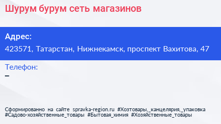 Шурум бурум, сеть магазинов по адресу 423571, Татарстан, Нижнекамск, проспект Вахитова, 47 в дальнейшем Организация, размещена в следующих категориях: