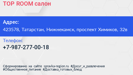 TOP ROOM, салон по адресу 423578, Татарстан, Нижнекамск, проспект Химиков, 32в в дальнейшем Организация, размещена в следующих категориях: